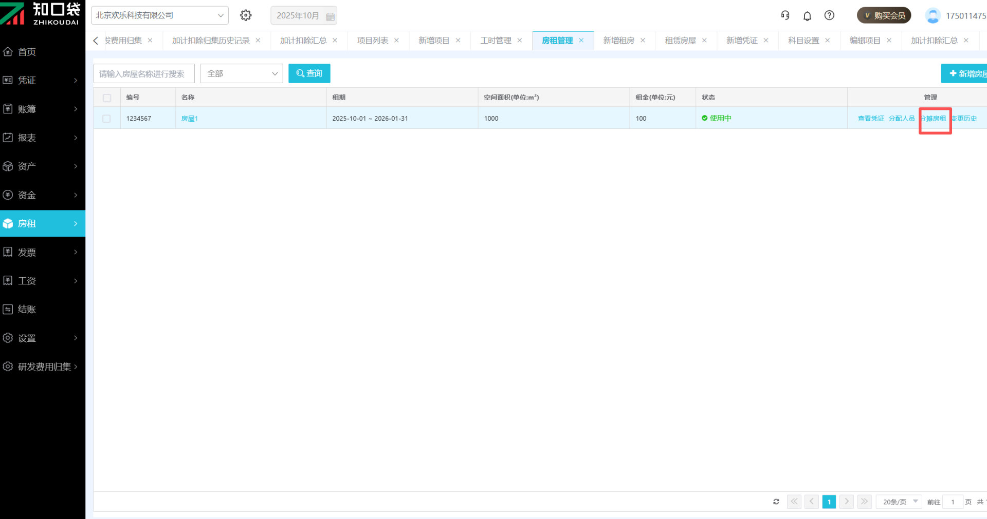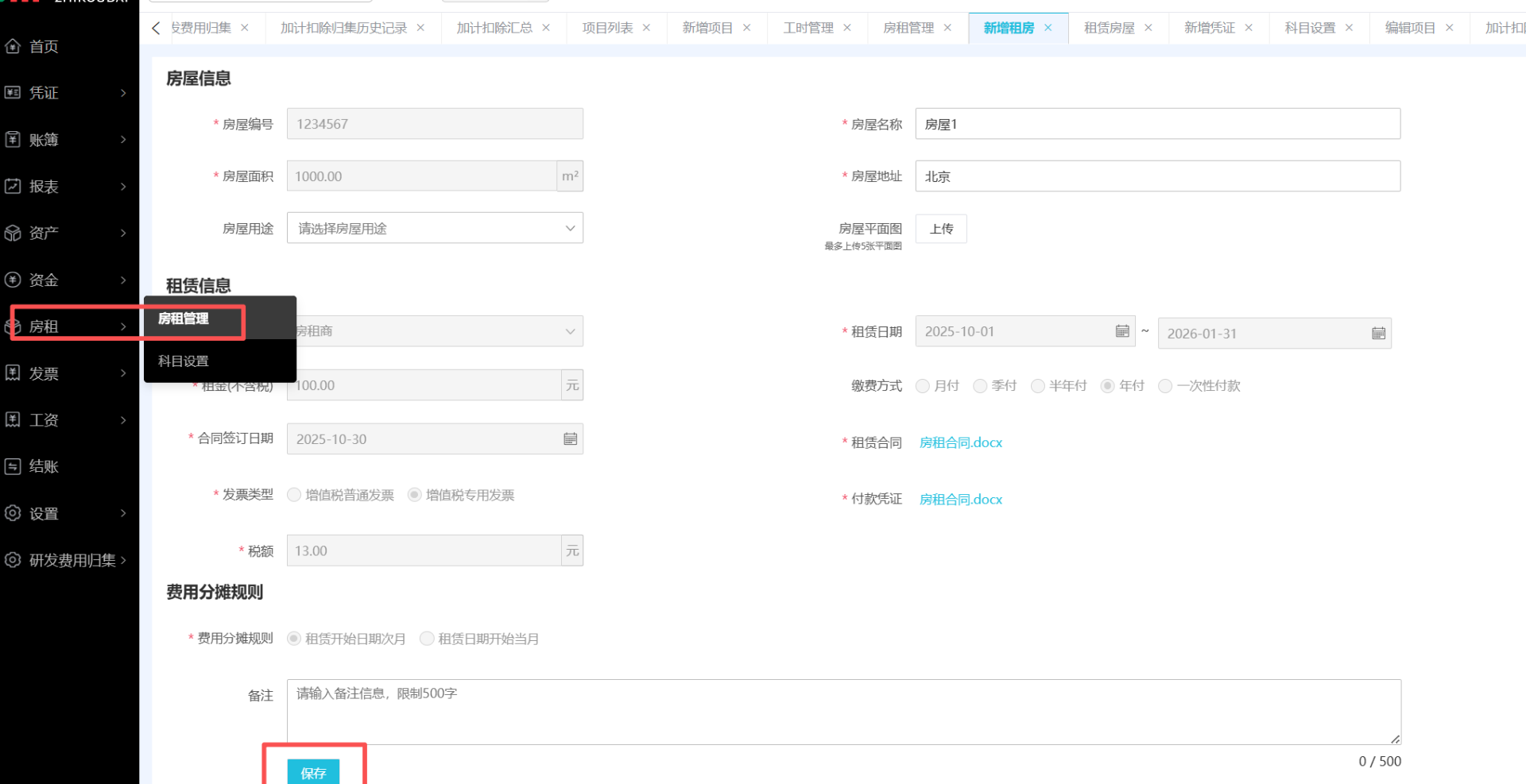 房租成本可以分摊到研发项目中,平台提供了专门的房租管理模块,您可按实际合同录入租金、租赁面积、租期等关键信息。