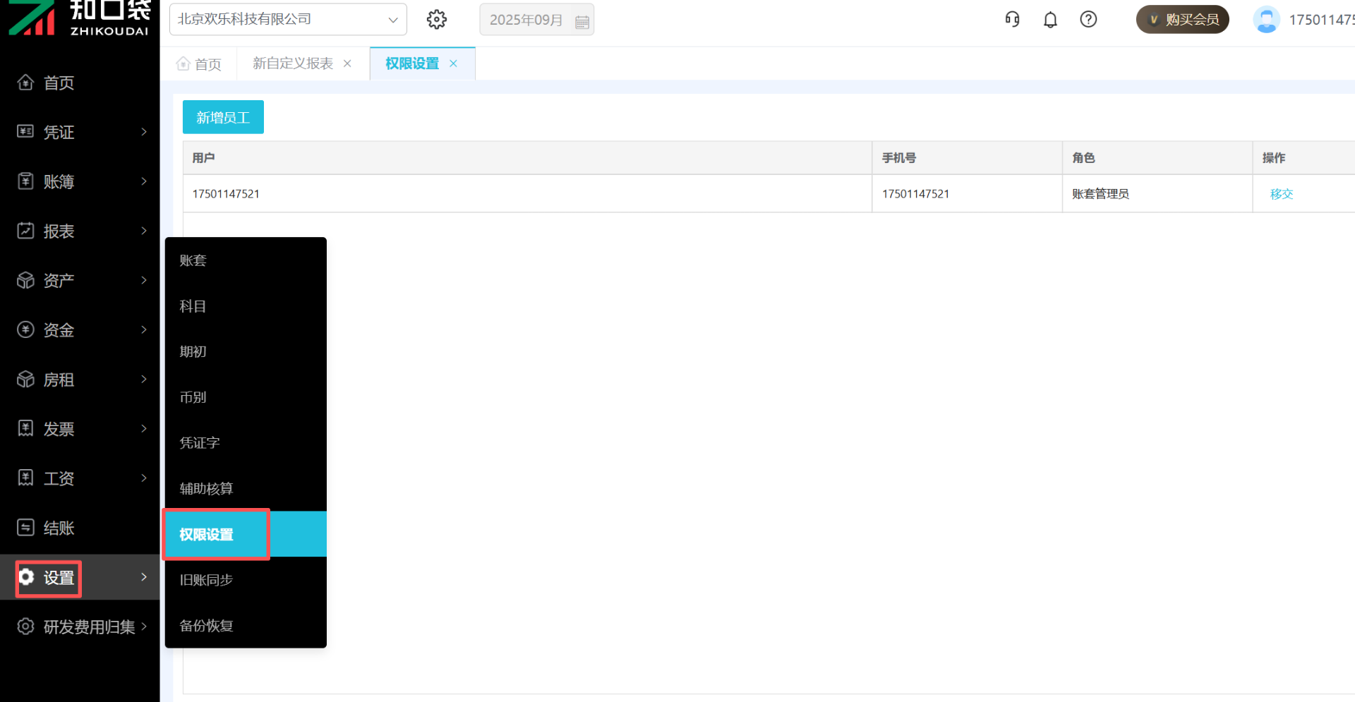 在【权限设置】页面可查看本账套下的所有用户权限,如需添加用户,点击左上角的【新增员工】按钮。