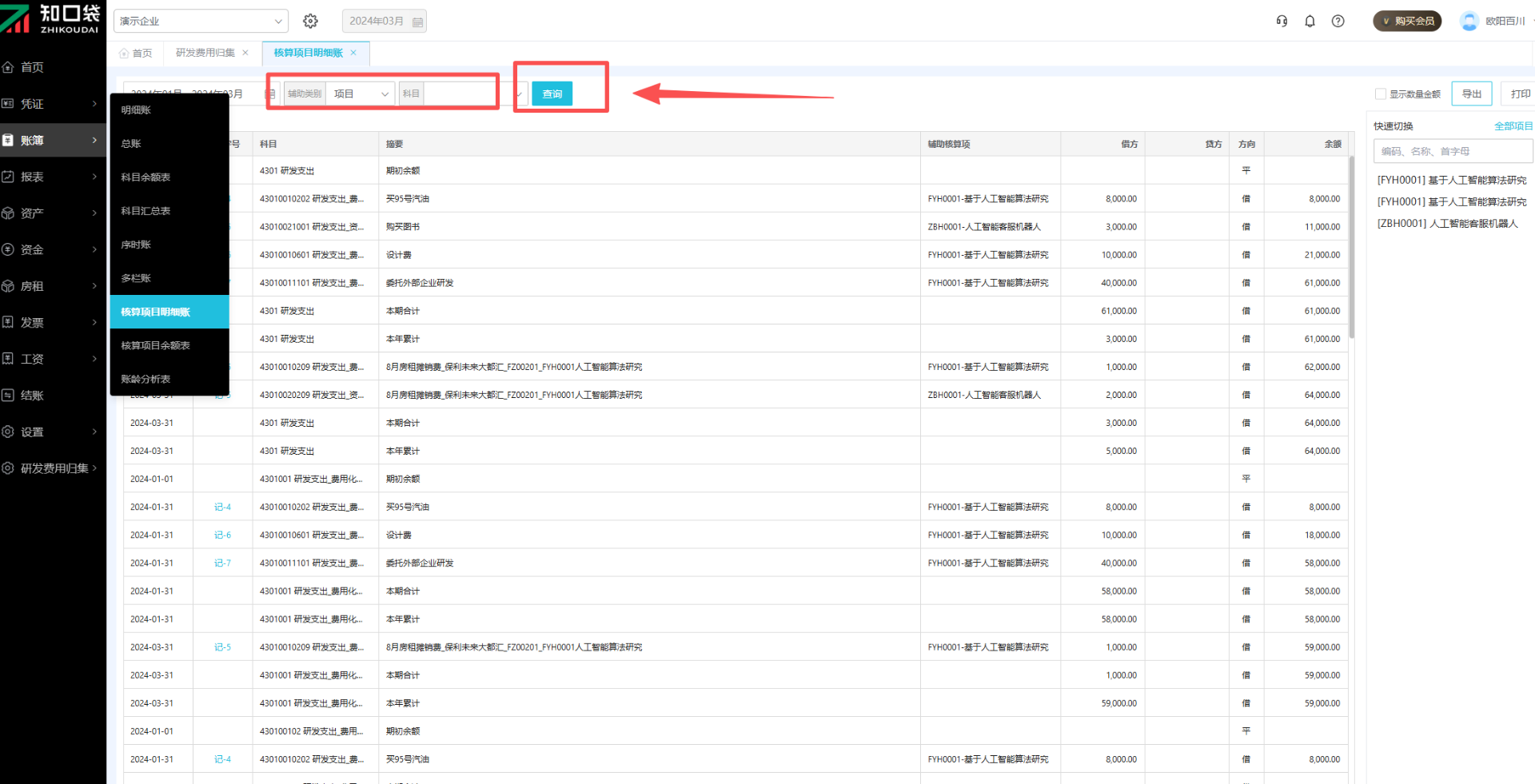 ①在左上角选择具体辅助类别,然后点击【查询】按钮查看该类别的核算项目明细账。