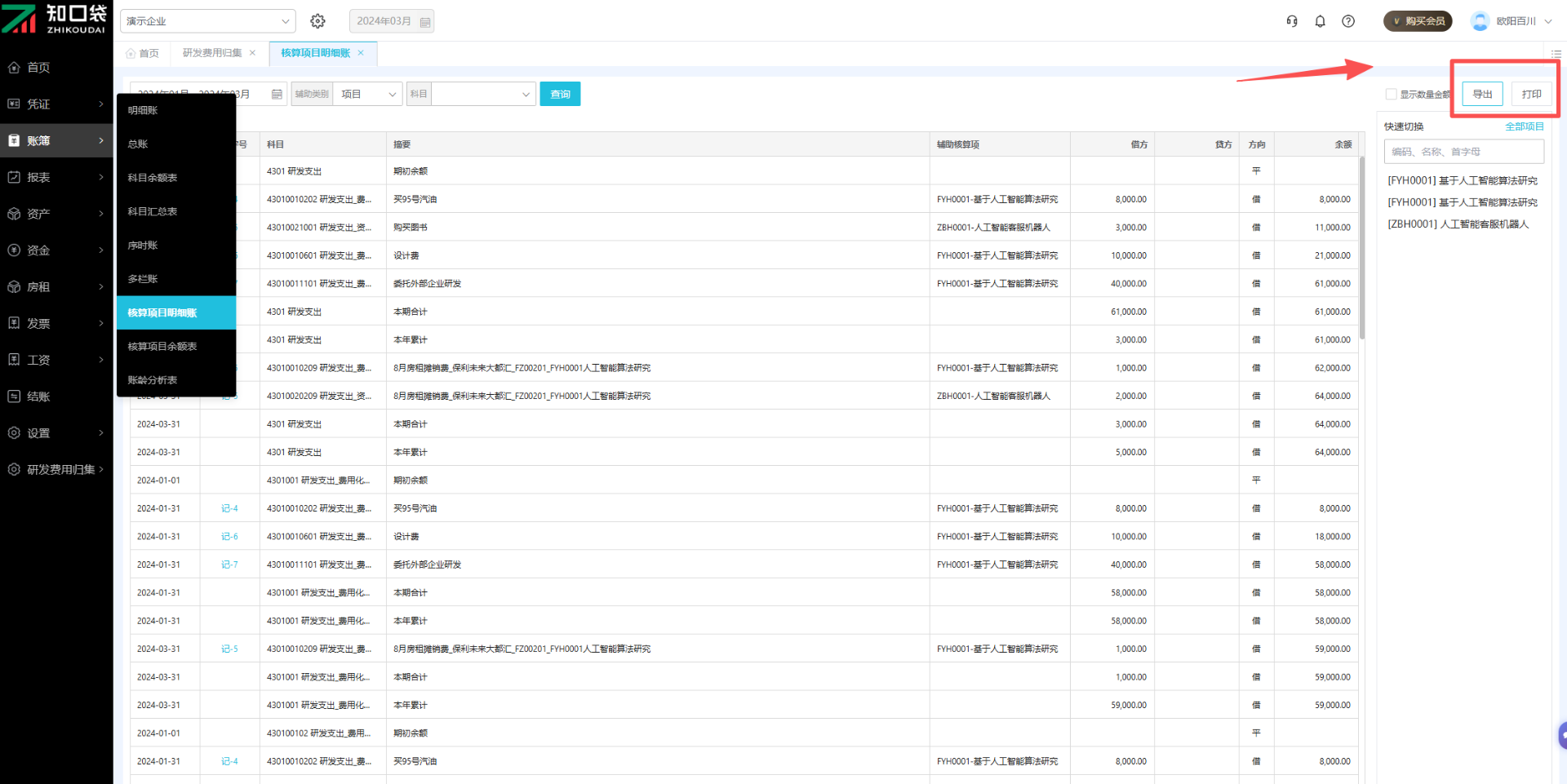 点击相应账簿右上角【打印】/【导出】可直接打印或导出该账簿。
