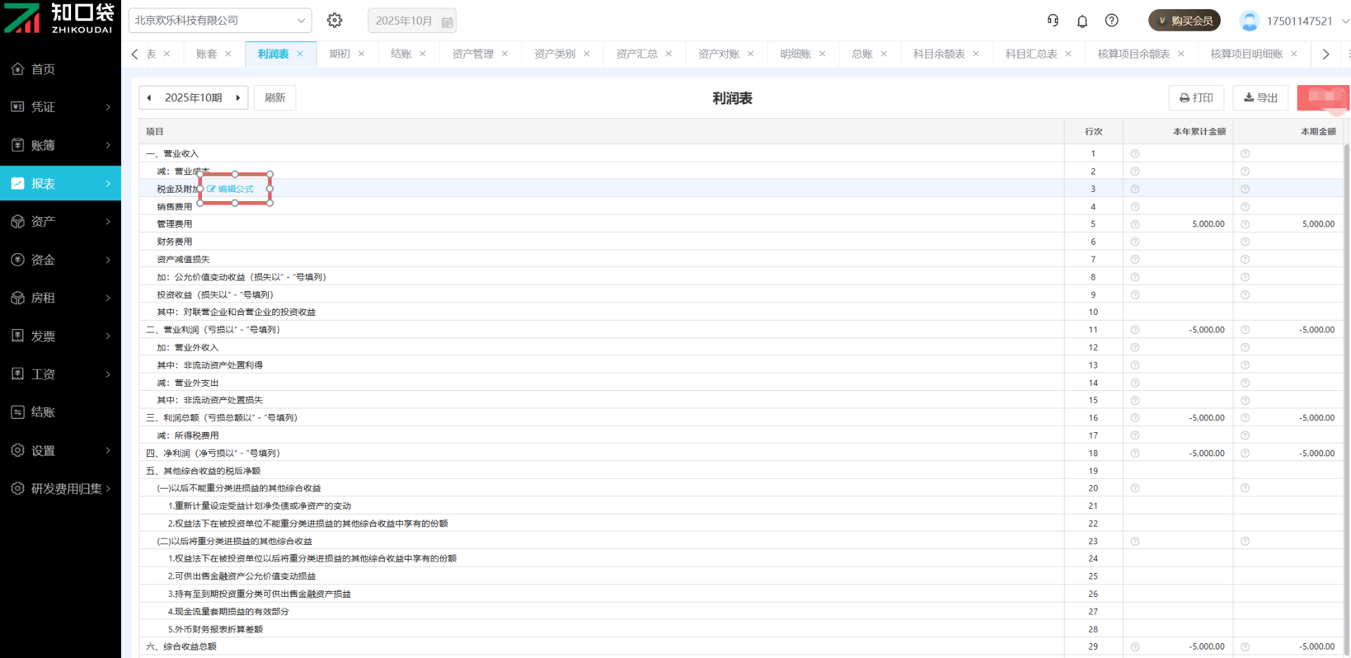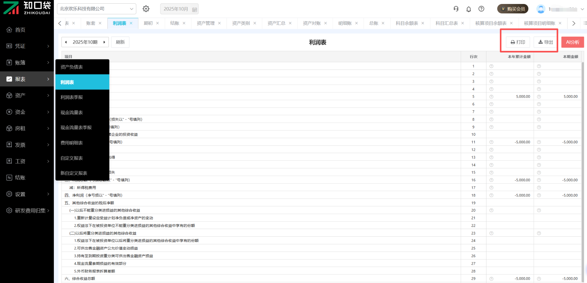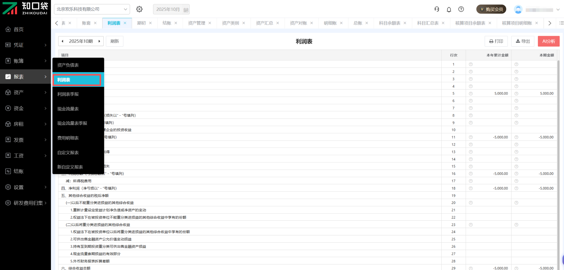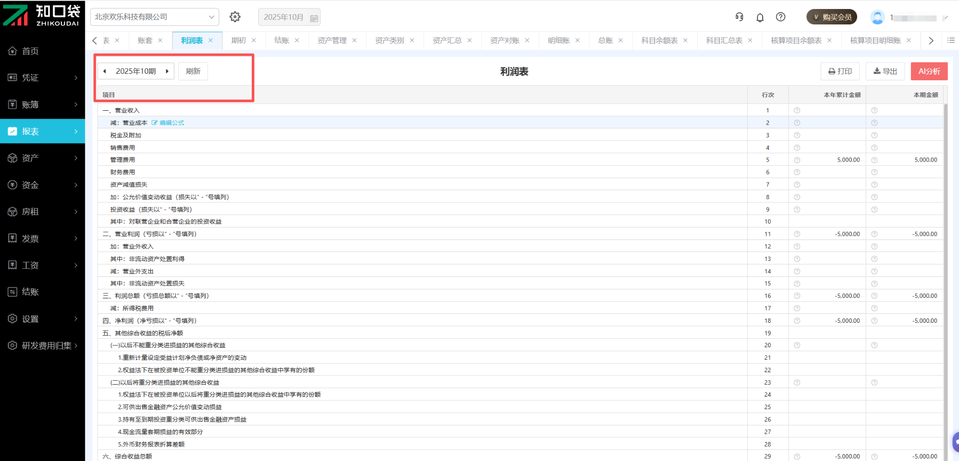 点击【报表】-【利润表】,可查看该报表,点击左上角的会计期间可切换月份。