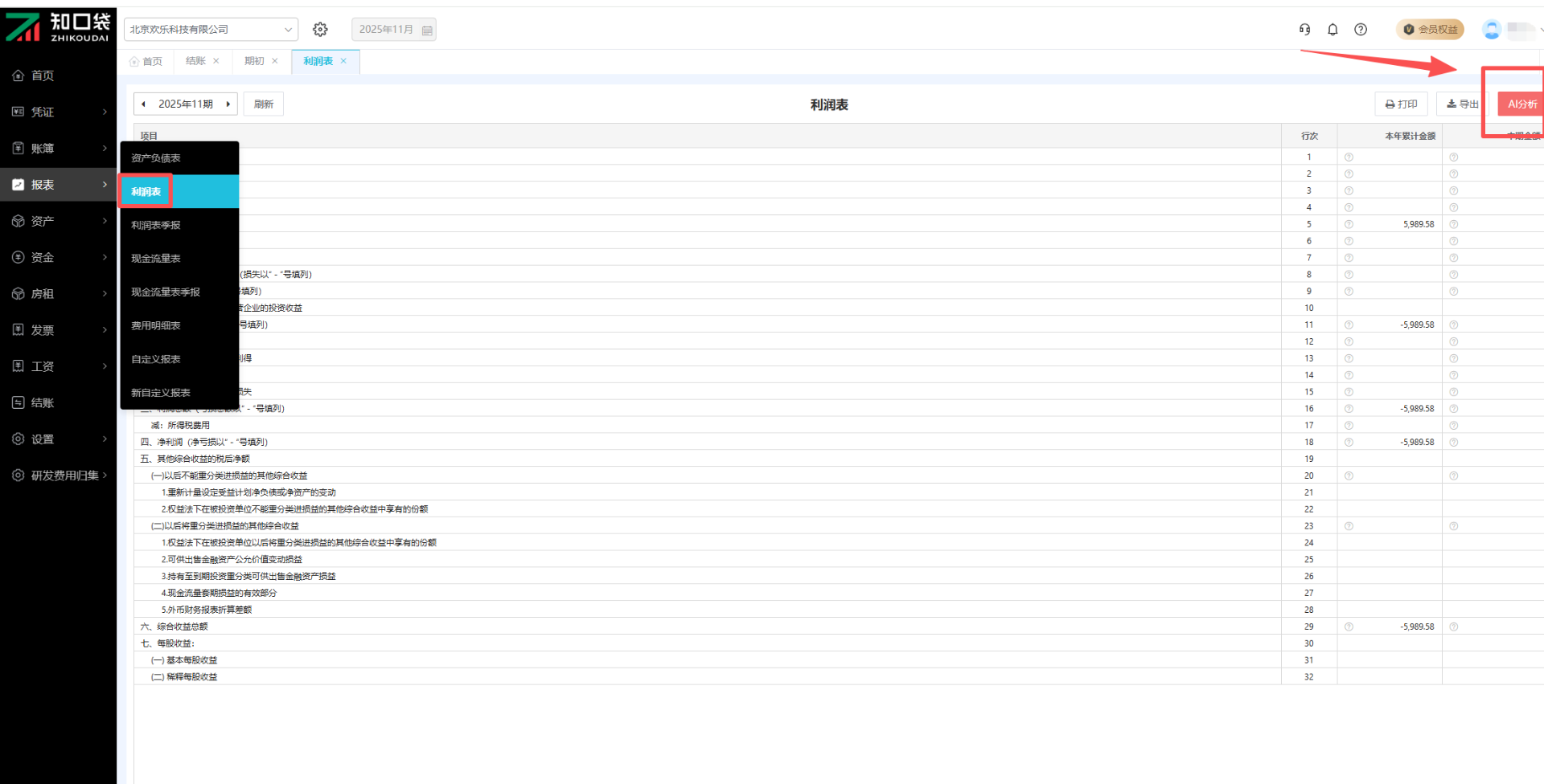 点击【报表】-【利润表】即可进入页面。