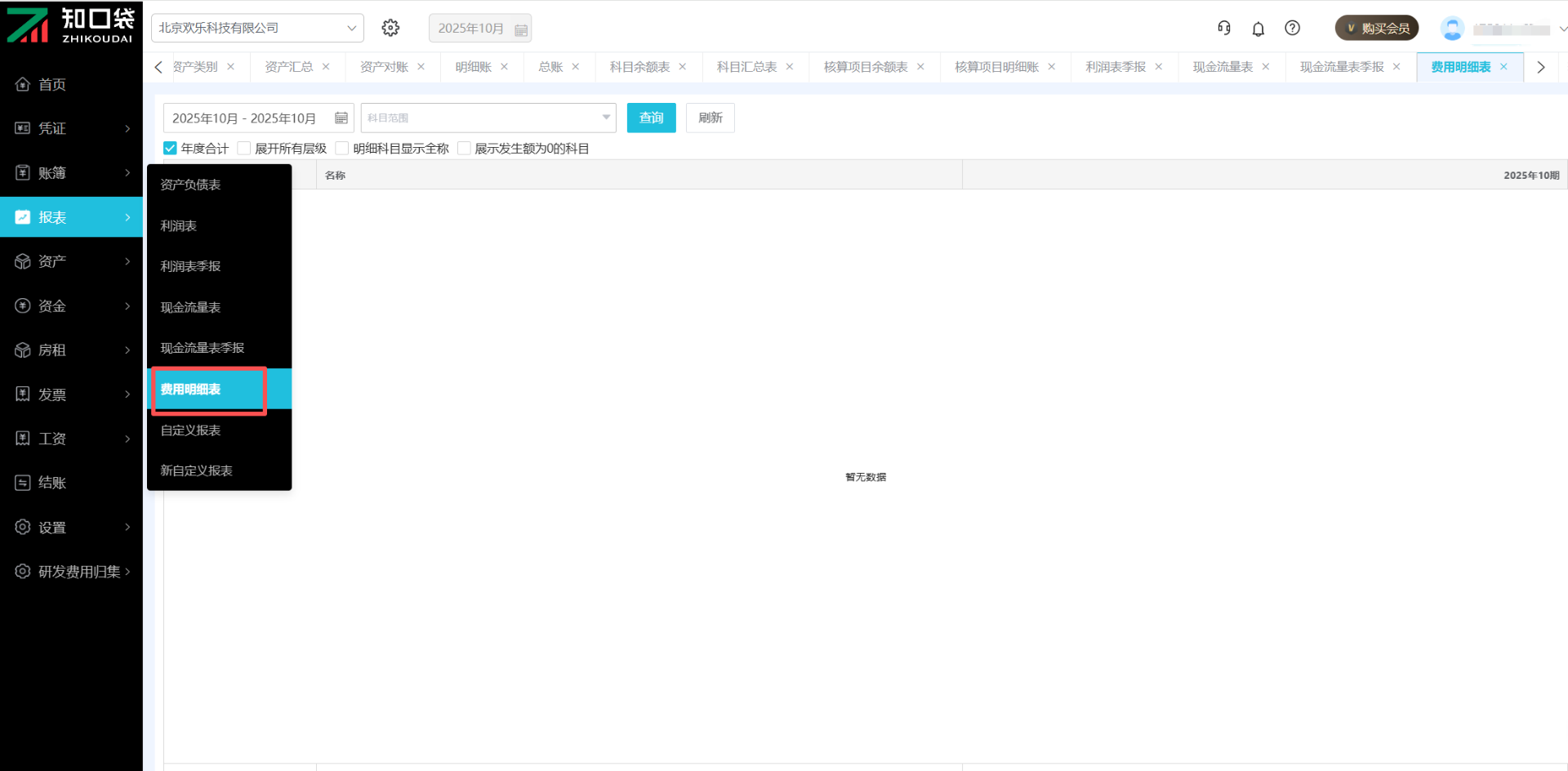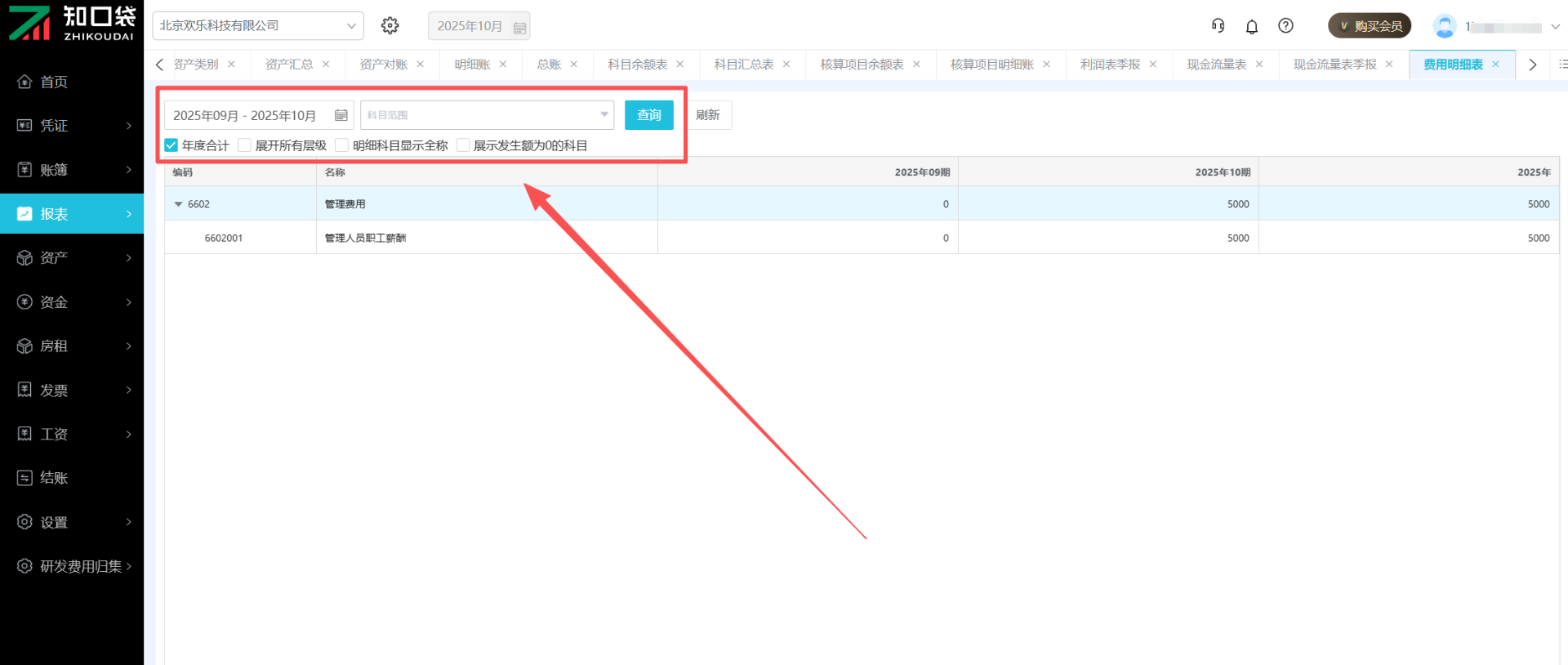 点击菜单栏【报表】-【费用明细表】,即可查看报表;支持自定义会计期间、科目、显示年度合计、展开所有级次、明细科目显示全称和展示发生额为0的科目。