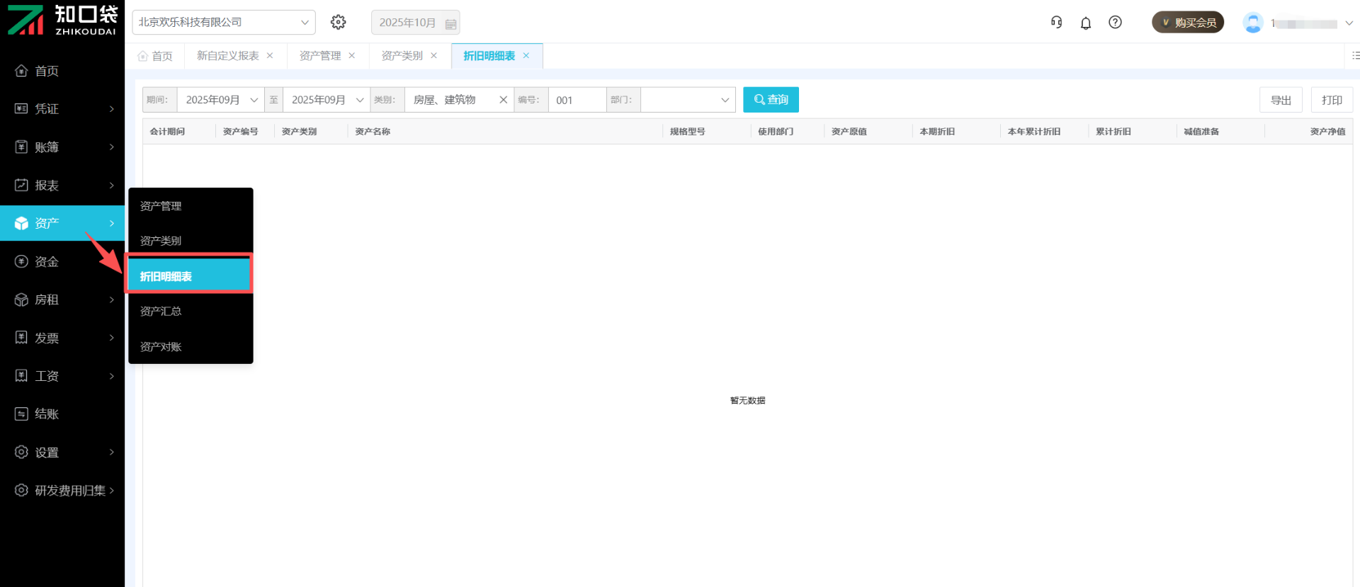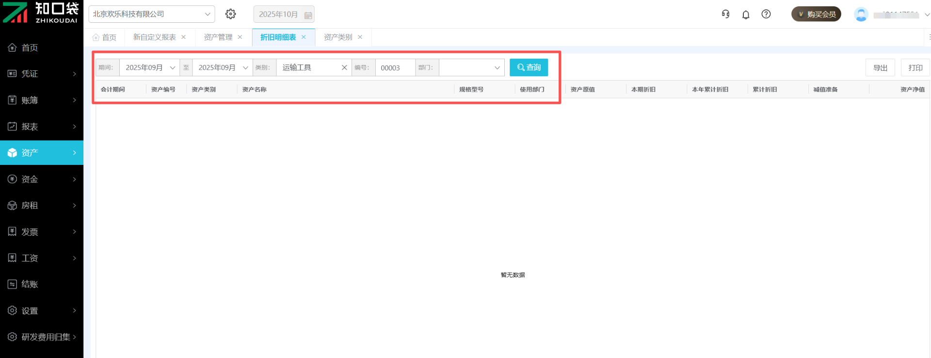 支持按照会计期间、资产类别、资产编号、以及资产使用部门筛选查询数据。点击右上角可【导出】/【打印】数据。