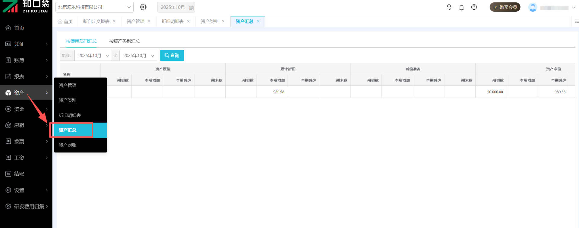 点击【资产】-【资产汇总】即可查看固定资产汇总表。