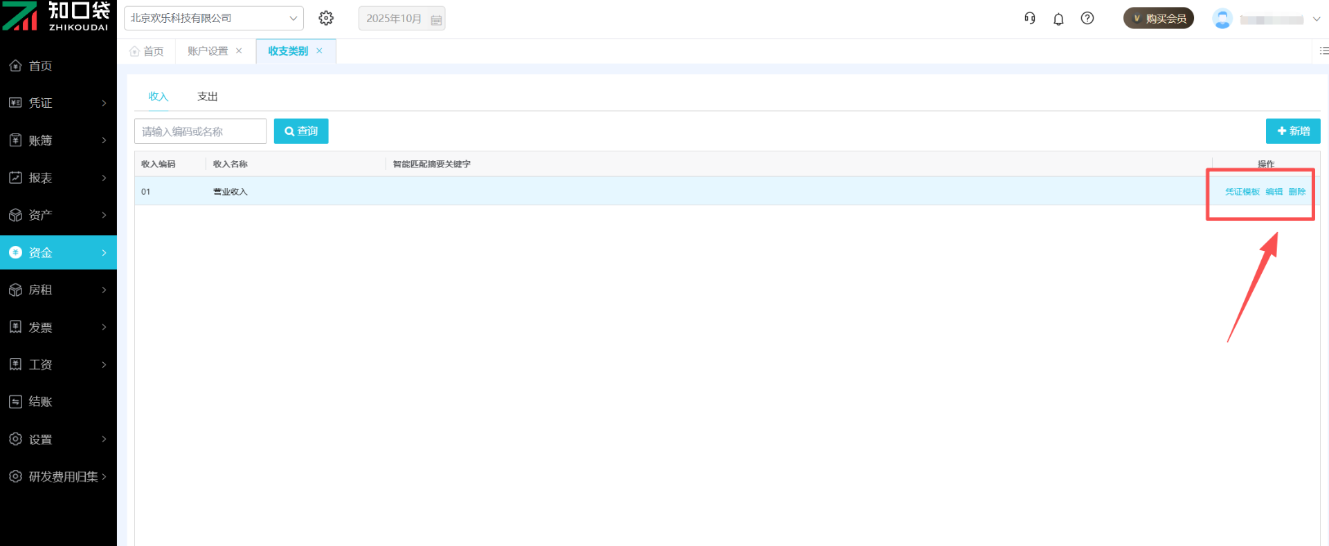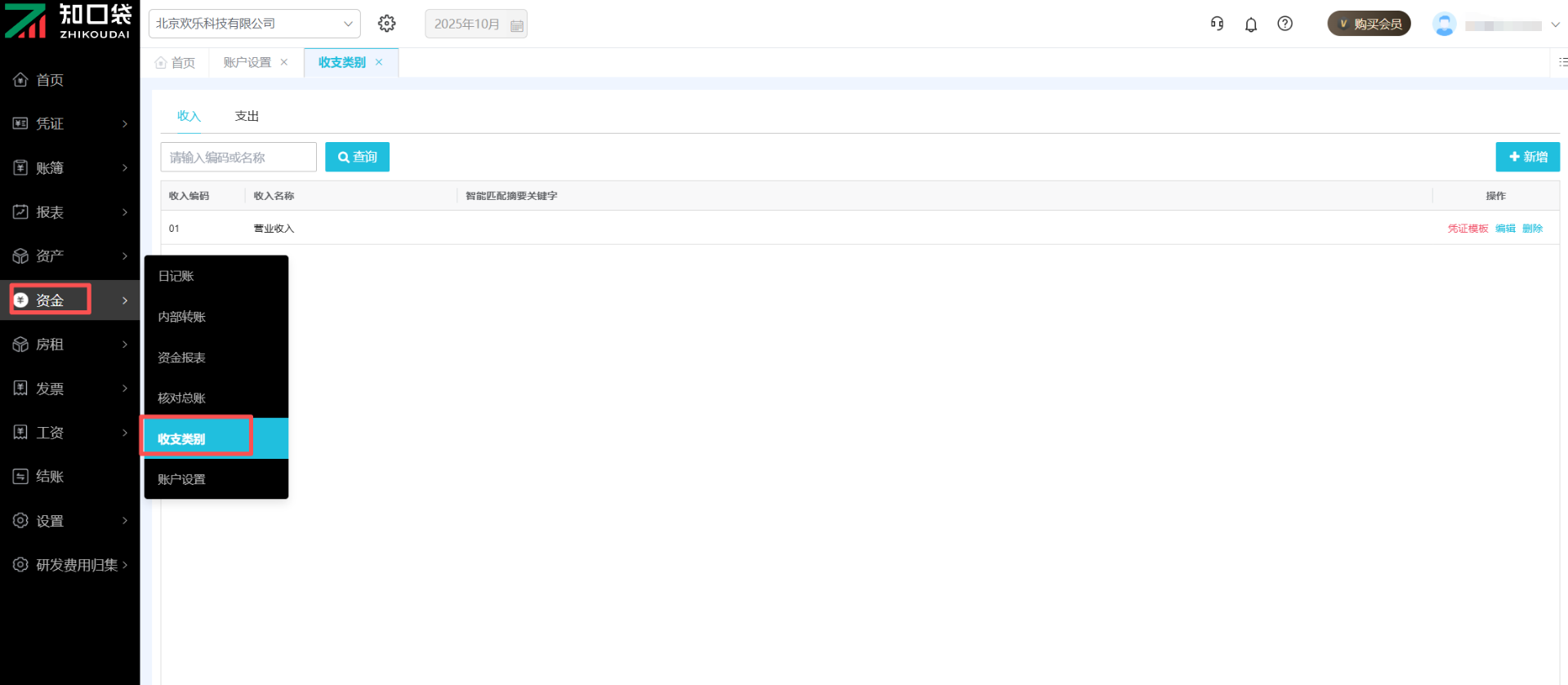 功能界面入口:点击主菜单的【资金】-【收支类别】即可进入功能页面;给资金分类,方便快速生成凭证。