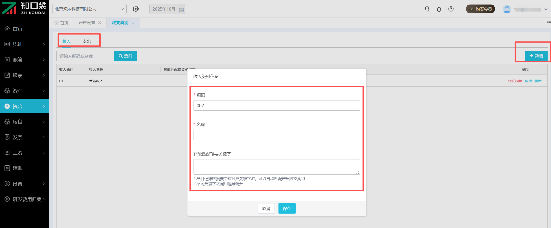 选择【收入】或【支出】,点击【新增】,可根据需求设置类别;输入【编码】、【名称】,都是必填项,编辑后点击【完成】即可保存。