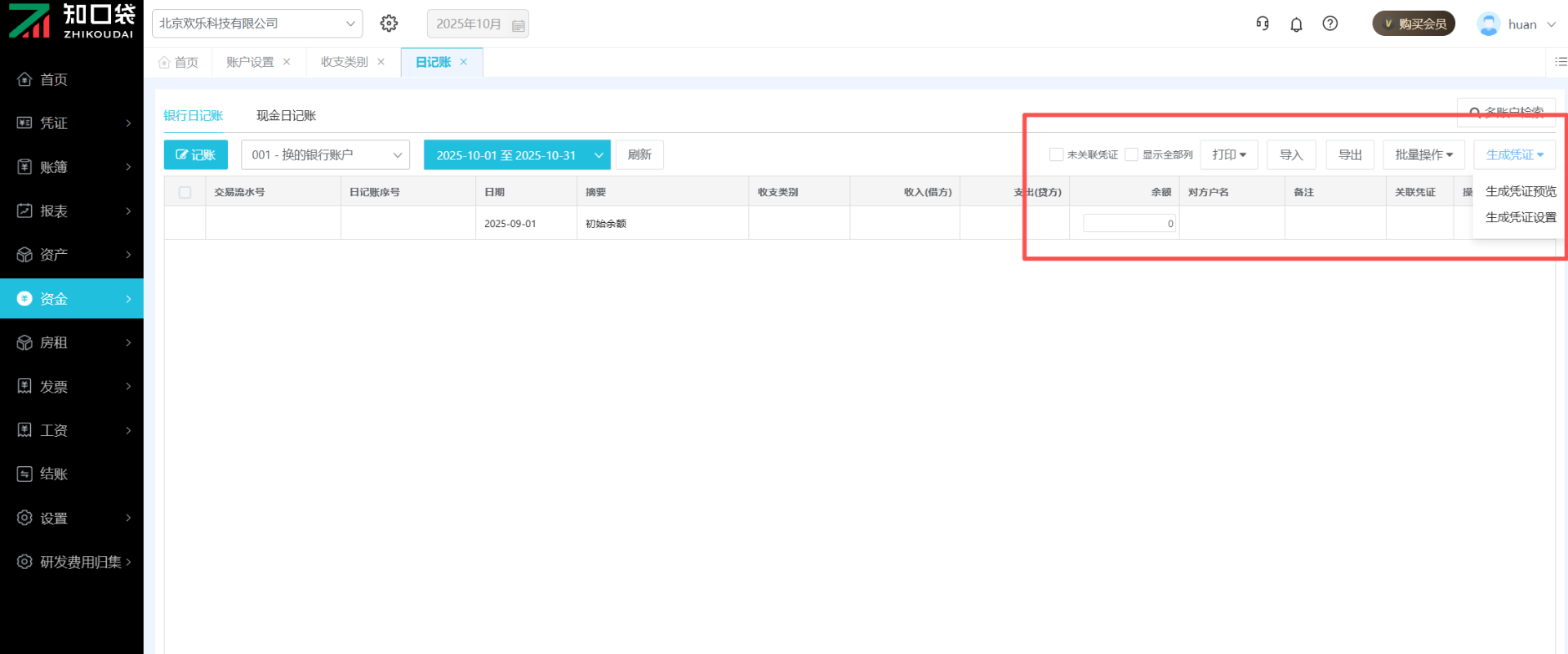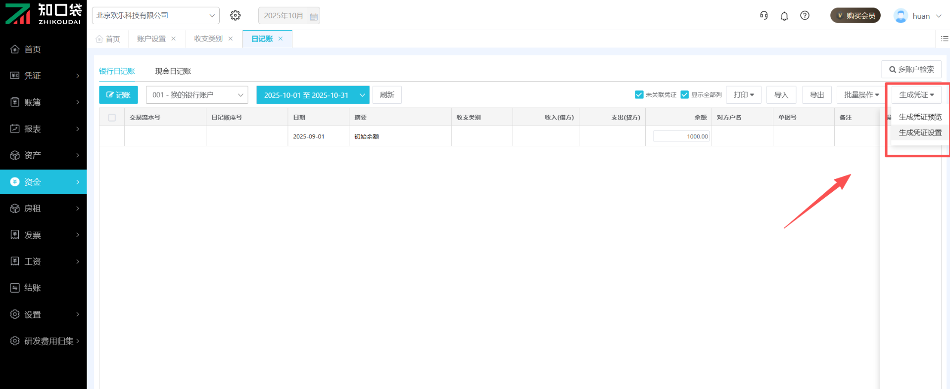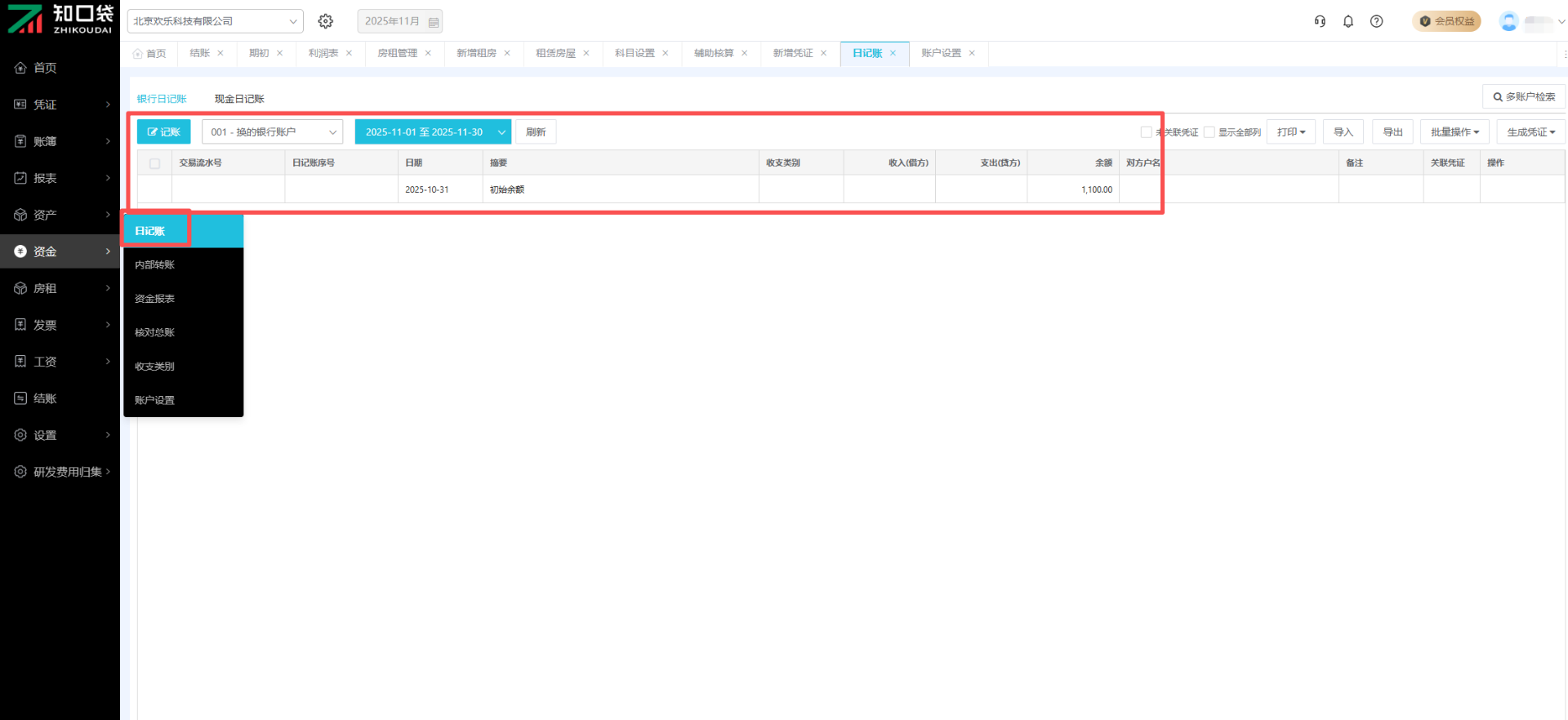 (1)点击页面中的“现金/银行日记账”,进入“现金/银行日记账”界面。