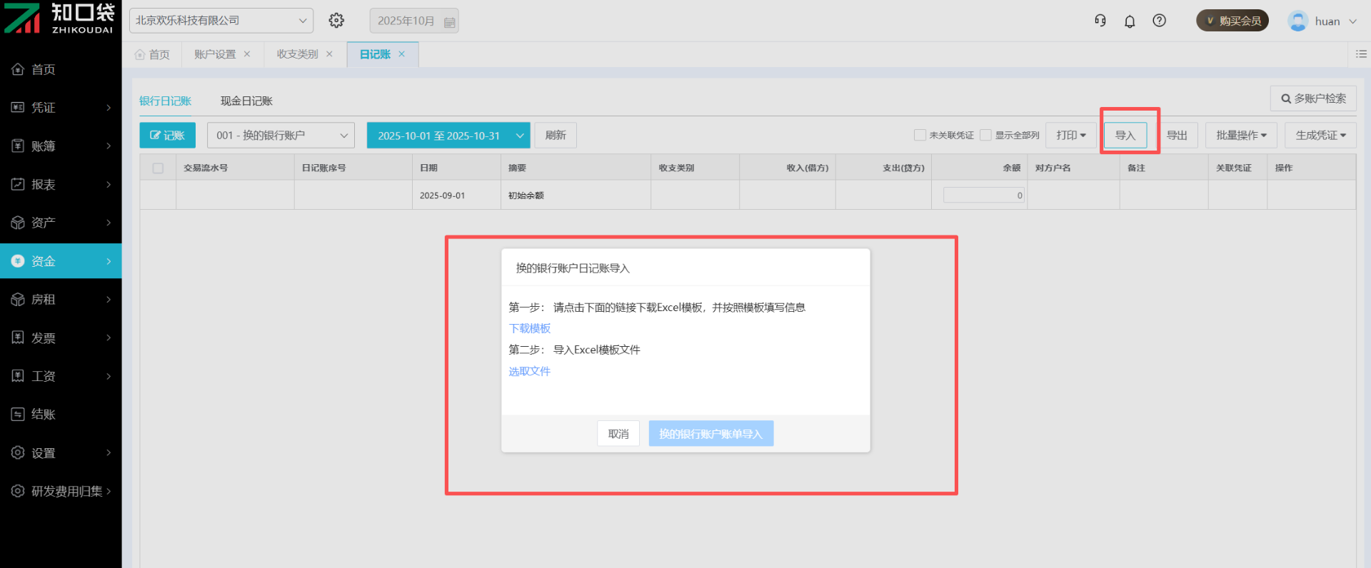 点击【导入】-【下载模板】-【选取文件】,下载日记账模板,按照模板格式进行数据整理再导入。模板中录入时,日期、摘要、收支类型,收入(借方)/支出(贷方)为必录项。