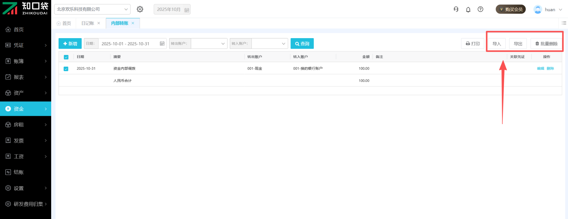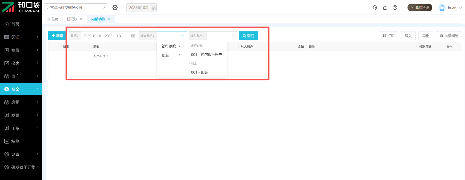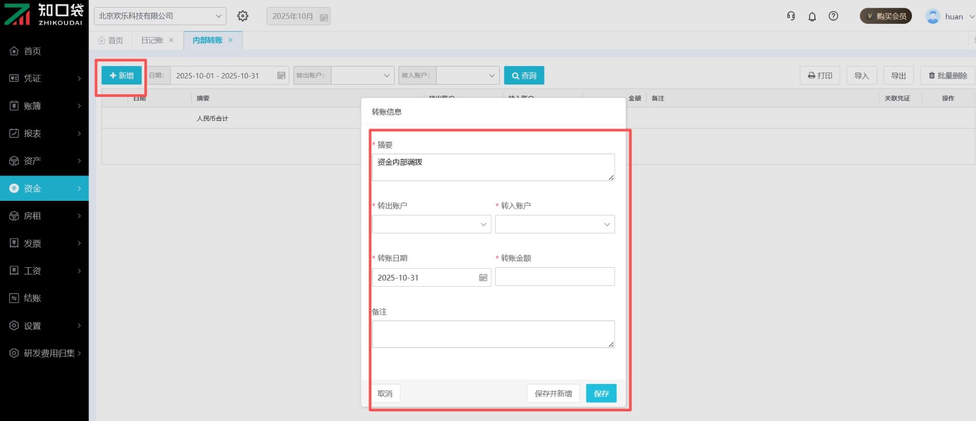 (1)点击主菜单的【资金】-【内部转账】即可进入功能页面。输入区域:根据实际情况记录,选择时间、转出账户、转入账户、金额、备注,填写完后点击保存即可。