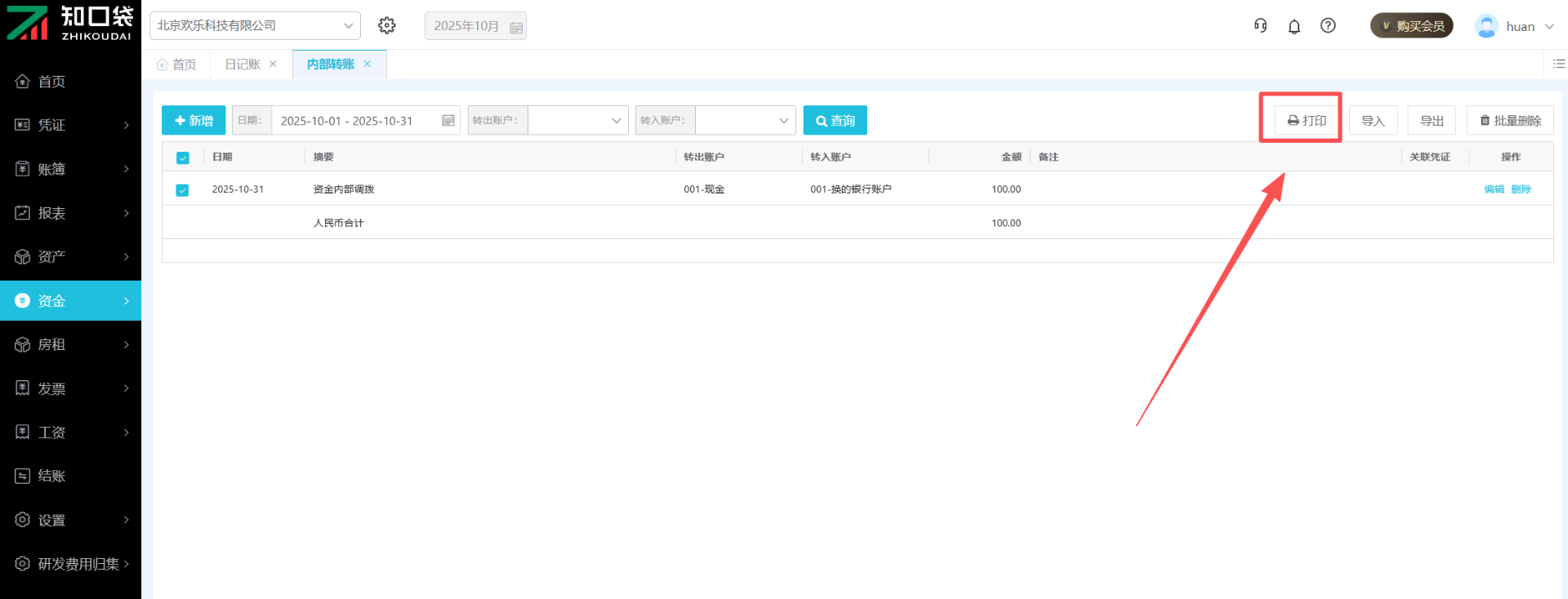 录入完毕后,对应资金账户日记账会自动更新有关内部调拨的记录,在日记账页面选到对应记录生成凭证即可。