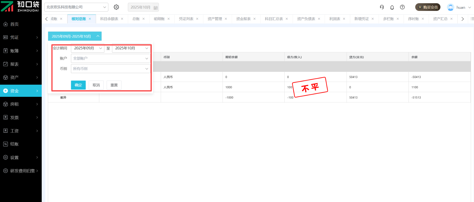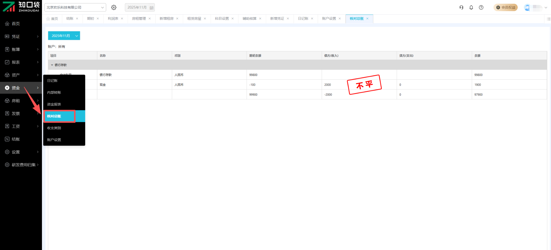 功能界面入口:点击主菜单的【资金】-【核对总账】即可进入功能页面。