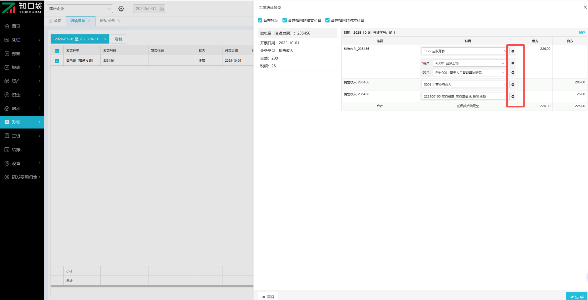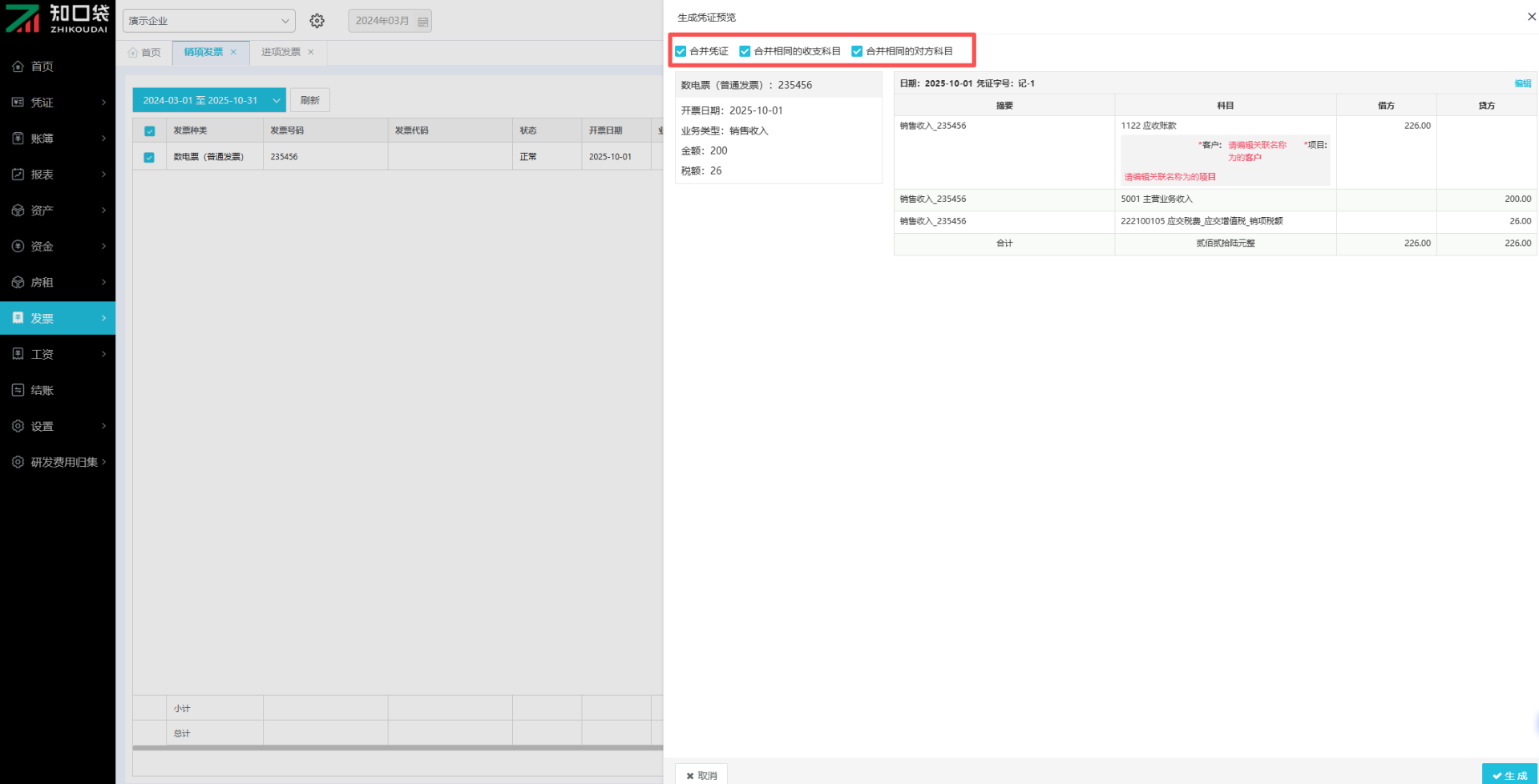 ②勾选【合并凭证】按钮,可合并相同的科目