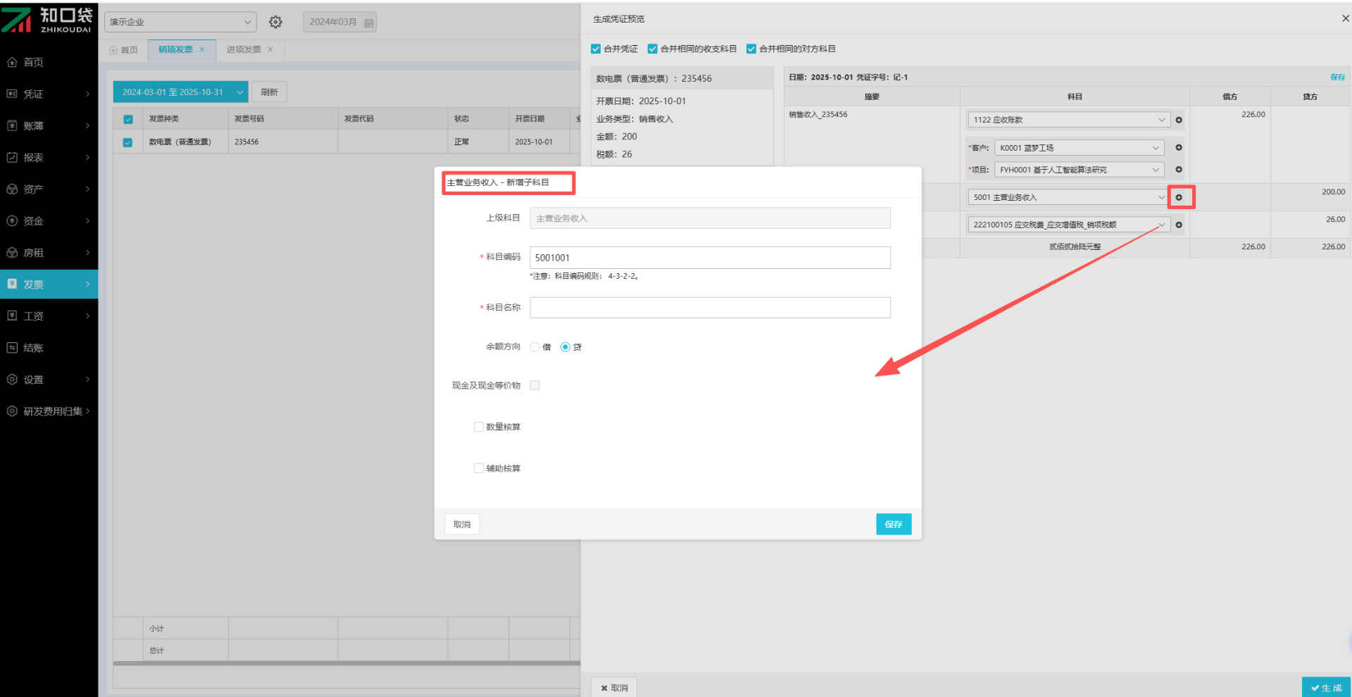 ③点击【编辑】按钮,可以进行次级科目和辅助核算项新增,新增页面会自动带出发票对方抬头名称和最新编码