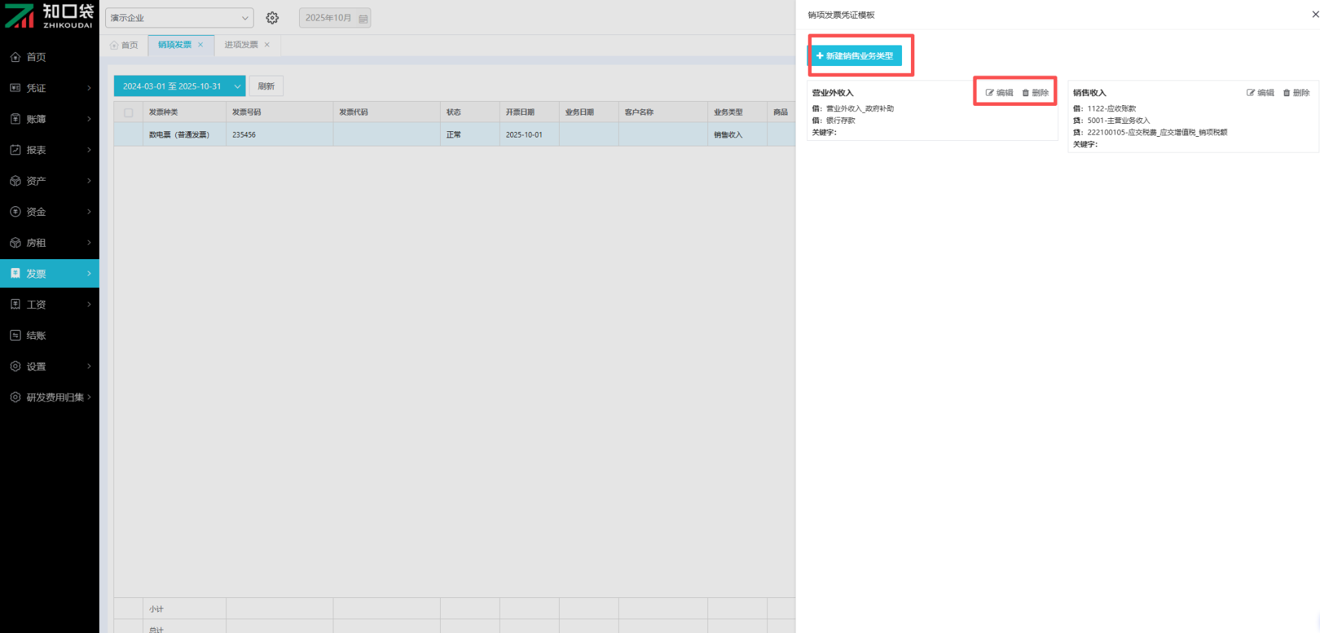 ①在发票编辑页面点击【业务类型管理】,进入发票模板,显示系统预设的凭证模板。