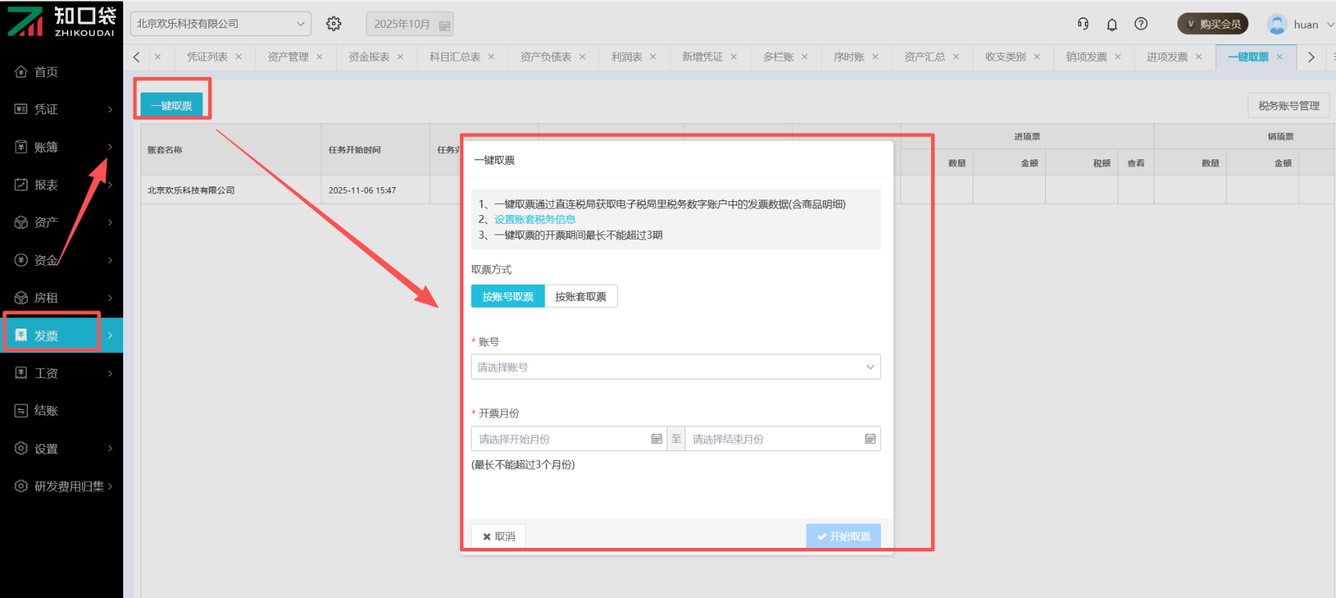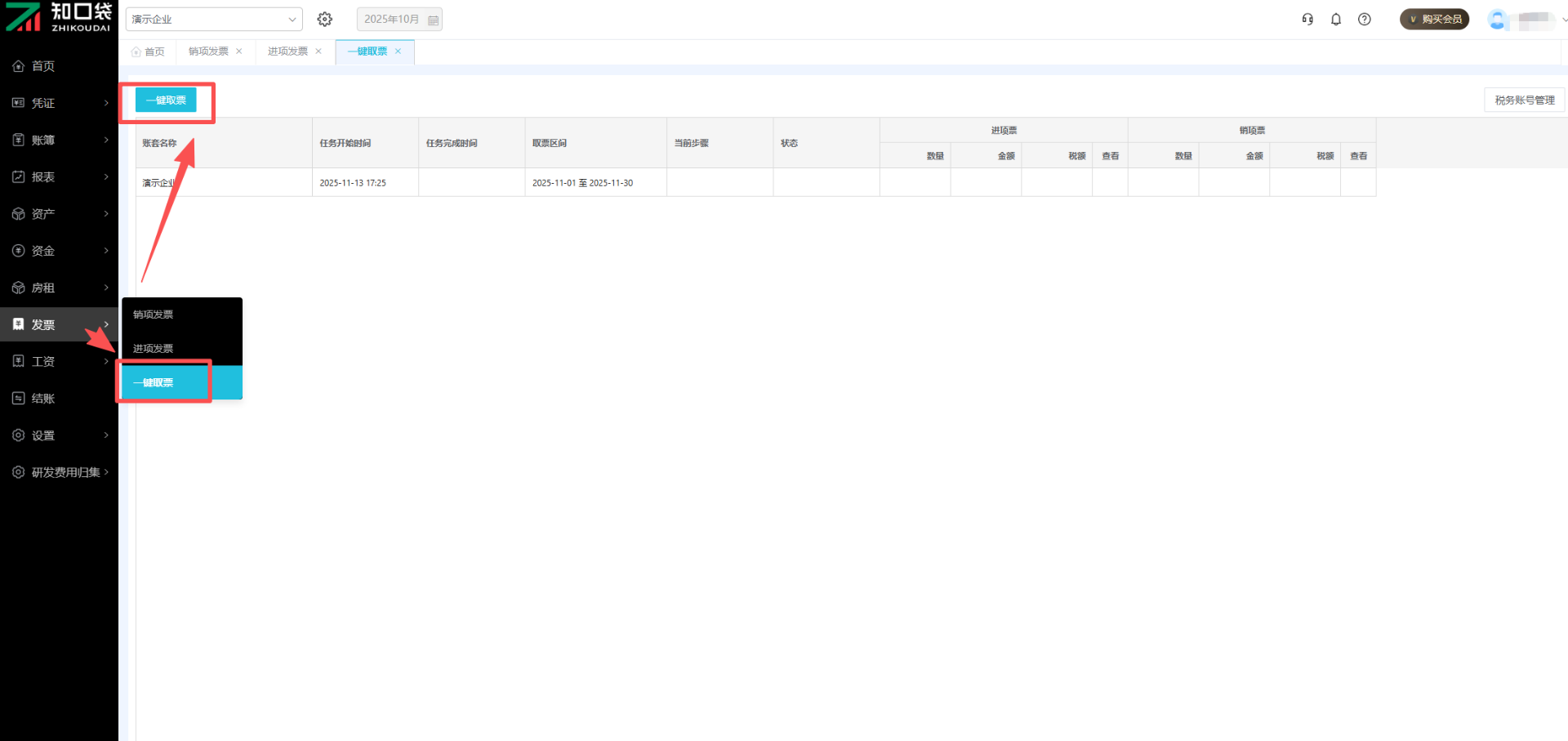 ①点击【发票】-【一键取票】,在左上角点击一键取票按钮