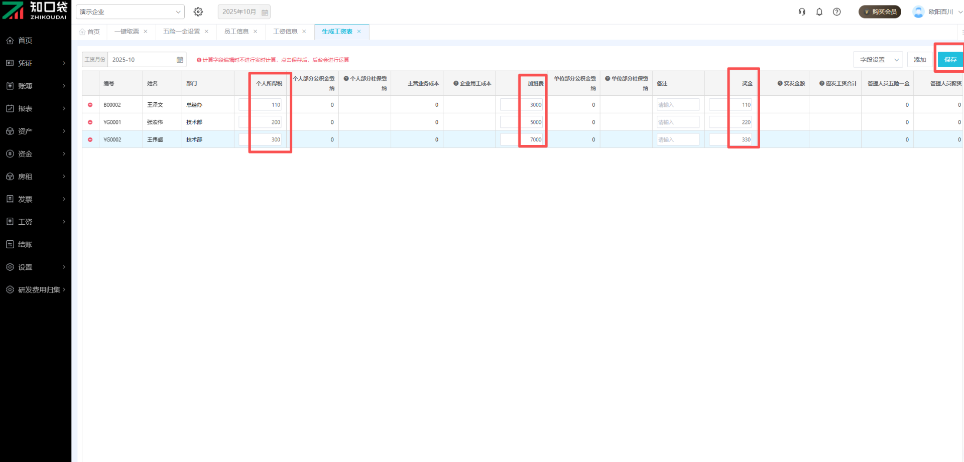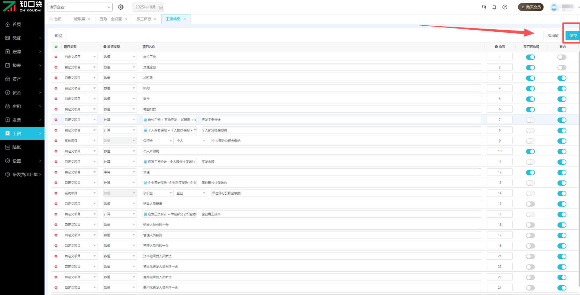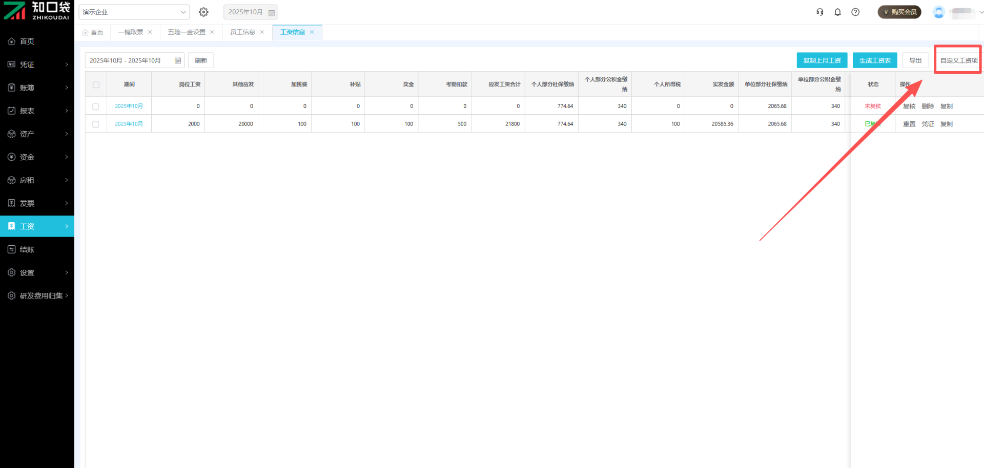 如果您想增减工资项目,可以根据公司实际情况编辑,点击【自定义工资项】,即可针对工资表进行定制,对应列可以增加需要增加、减扣、调整的信息;