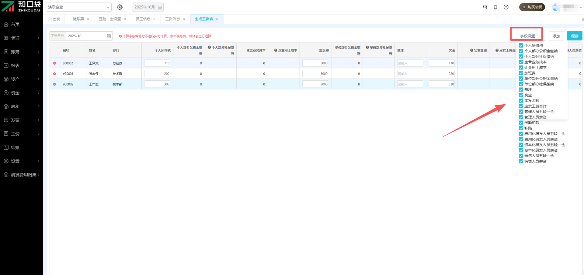 当月如果工资发放多次,可在【字段设置】进行单个工资表的字段修改。