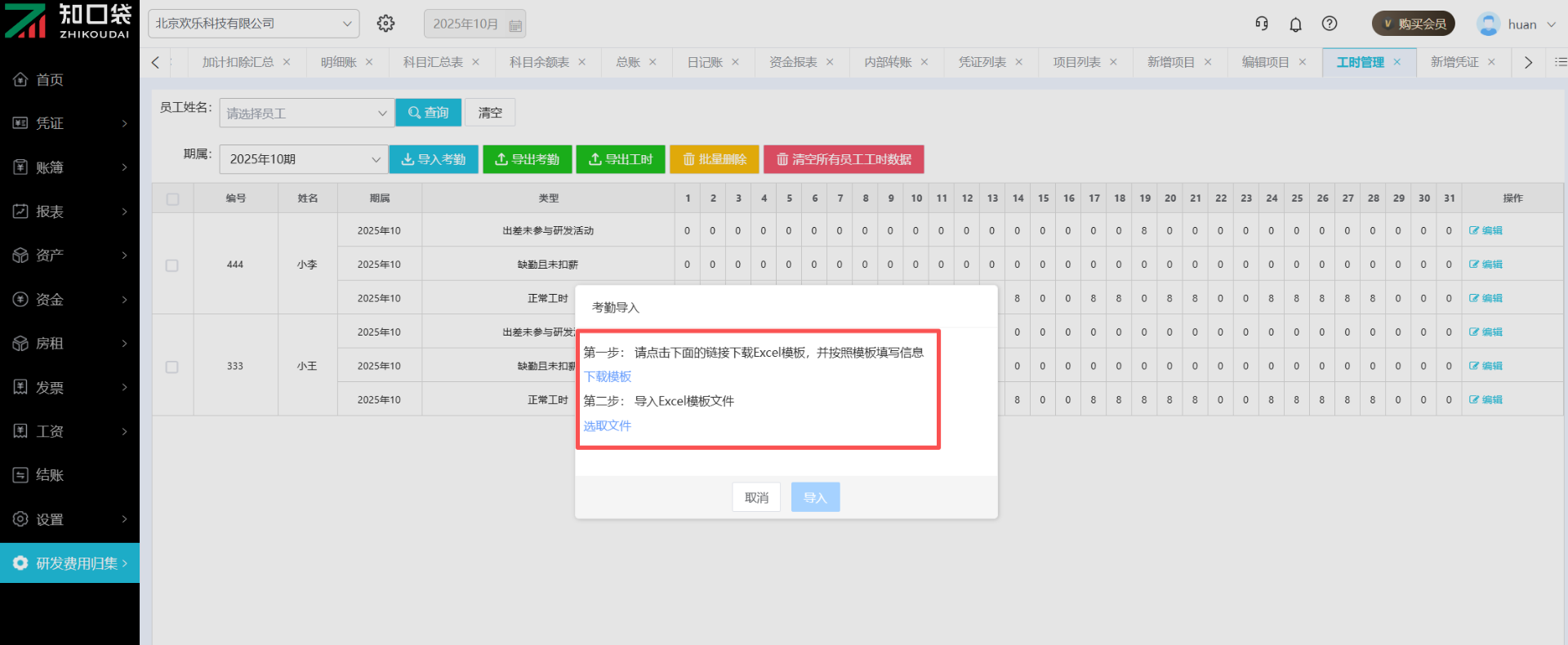 考勤信息录入考勤表之后点击【导入考勤】-选取文件,完成考勤导入