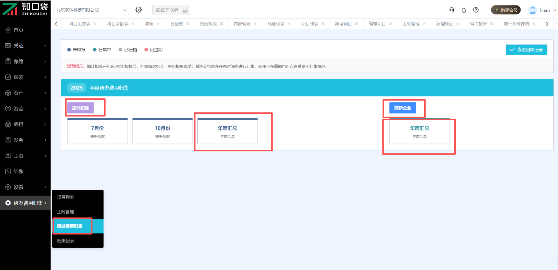 点击【研发费用归集】,可以看到加计扣除和高新技术企业口径下的研发费用归集和年度汇总。