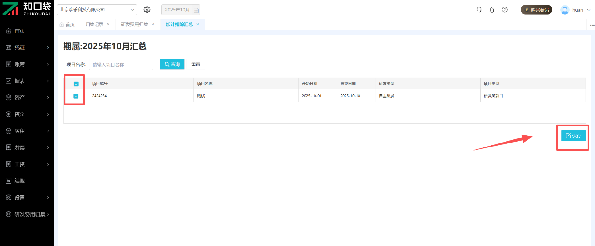 每个月要点击进入当月的汇总,勾选项目后点击保存完成归集。