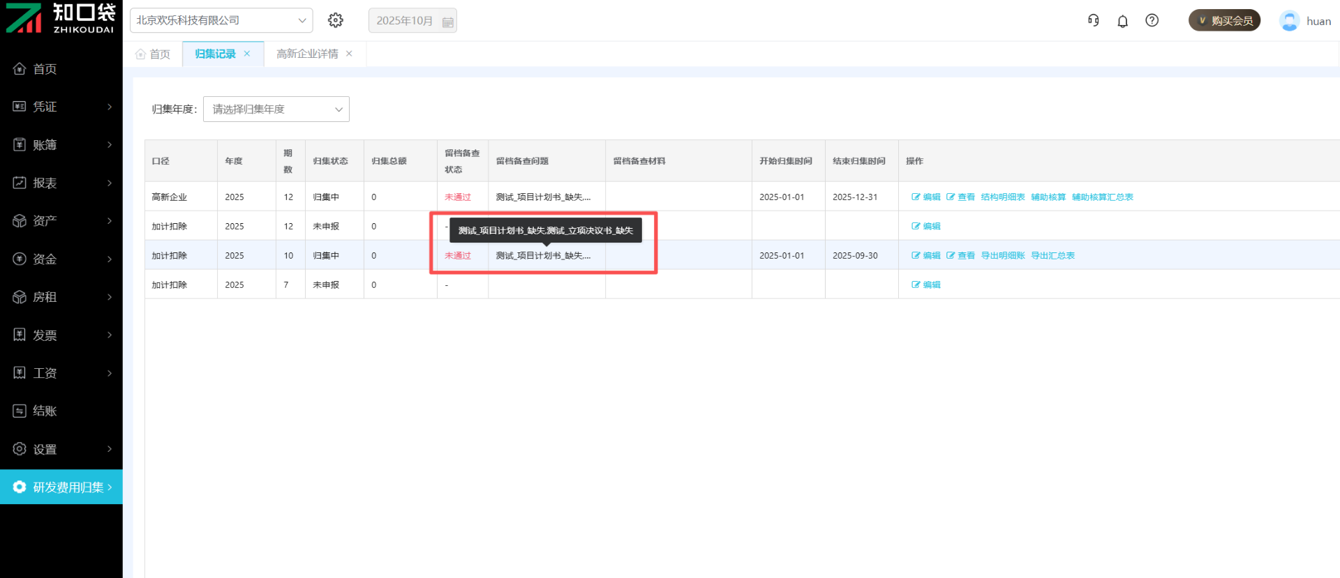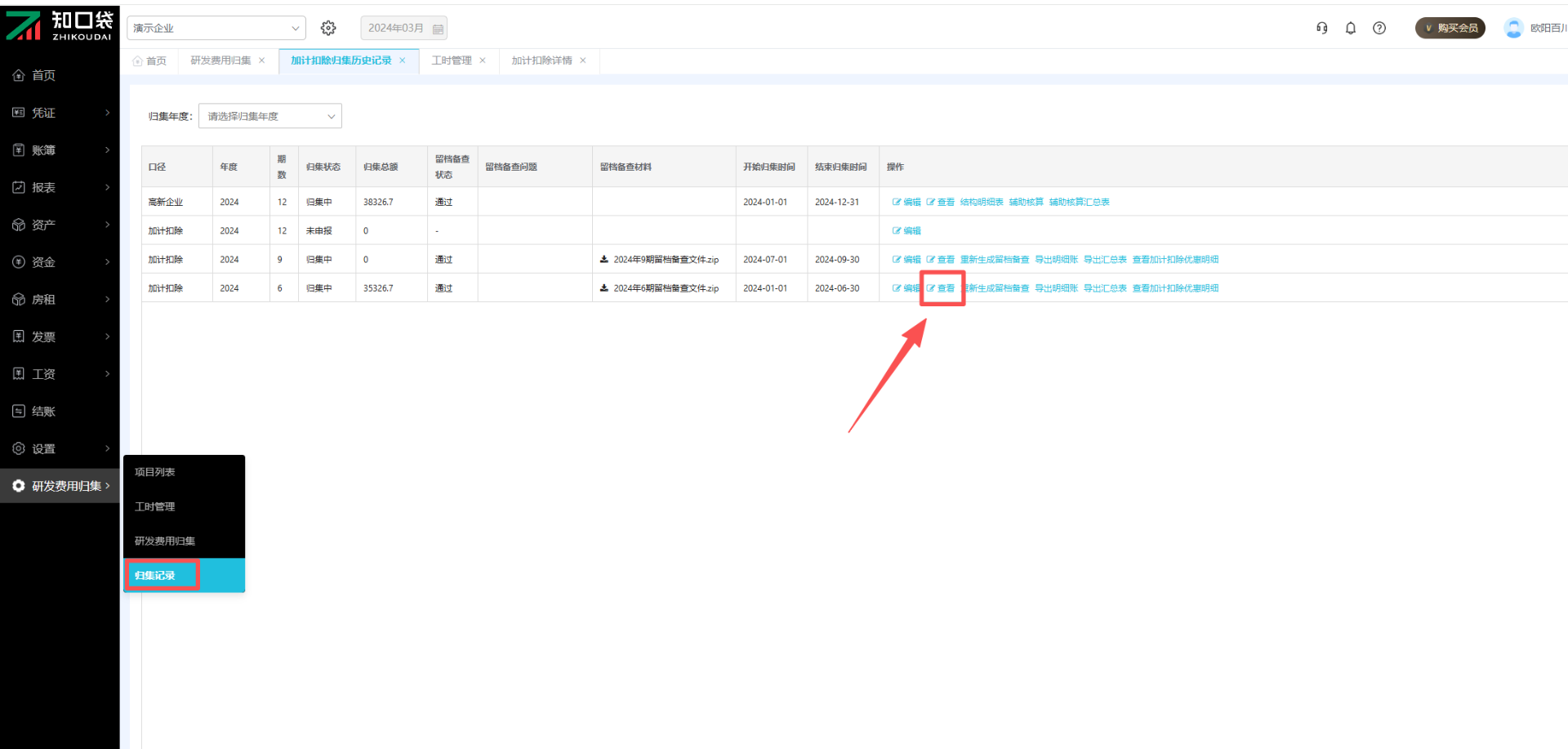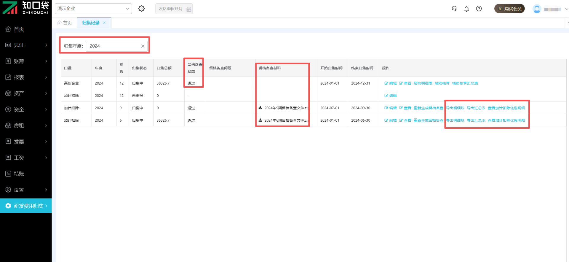 当需要申报加计扣除或高新企业认证时,点击【查看归集记录】,可以根据年份查看归集状态、留存备查状态,明细账、汇总表、留存备查资料也支持导出。加计扣除优惠明细可以实时查看并导出,方便人工校对核查数据。