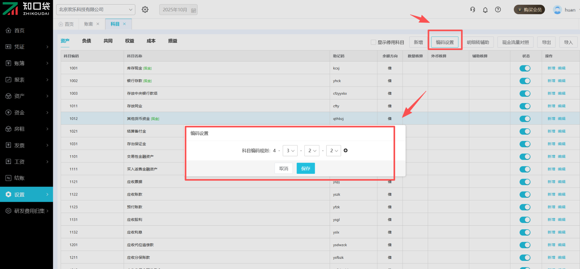 (2)操作步骤:点击【设置】-【科目】进入【科目管理】页面,点击右上角的【编码设置】可设置科目编码。科目级次最高可设置8级,编码长度最高可设置4位。