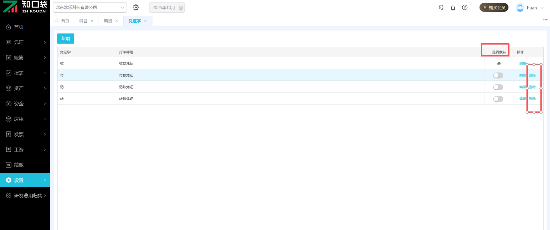 如需修改或删除凭证字,点击【设置】-【凭证字】,点击对应凭证字后的【编辑】/【删除】即可进行操作。